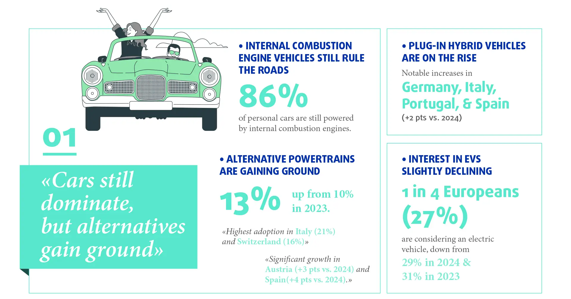 - Internal Combustion Engine (ICE) vehicles remain dominant (representing 86% of personal cars), but ownership of hybrid and electric models is progressing in specific countries (+ 2 pts vs. 2024 for plug-in hybrid vehicles in Germany, Italy, Portugal and Spain).