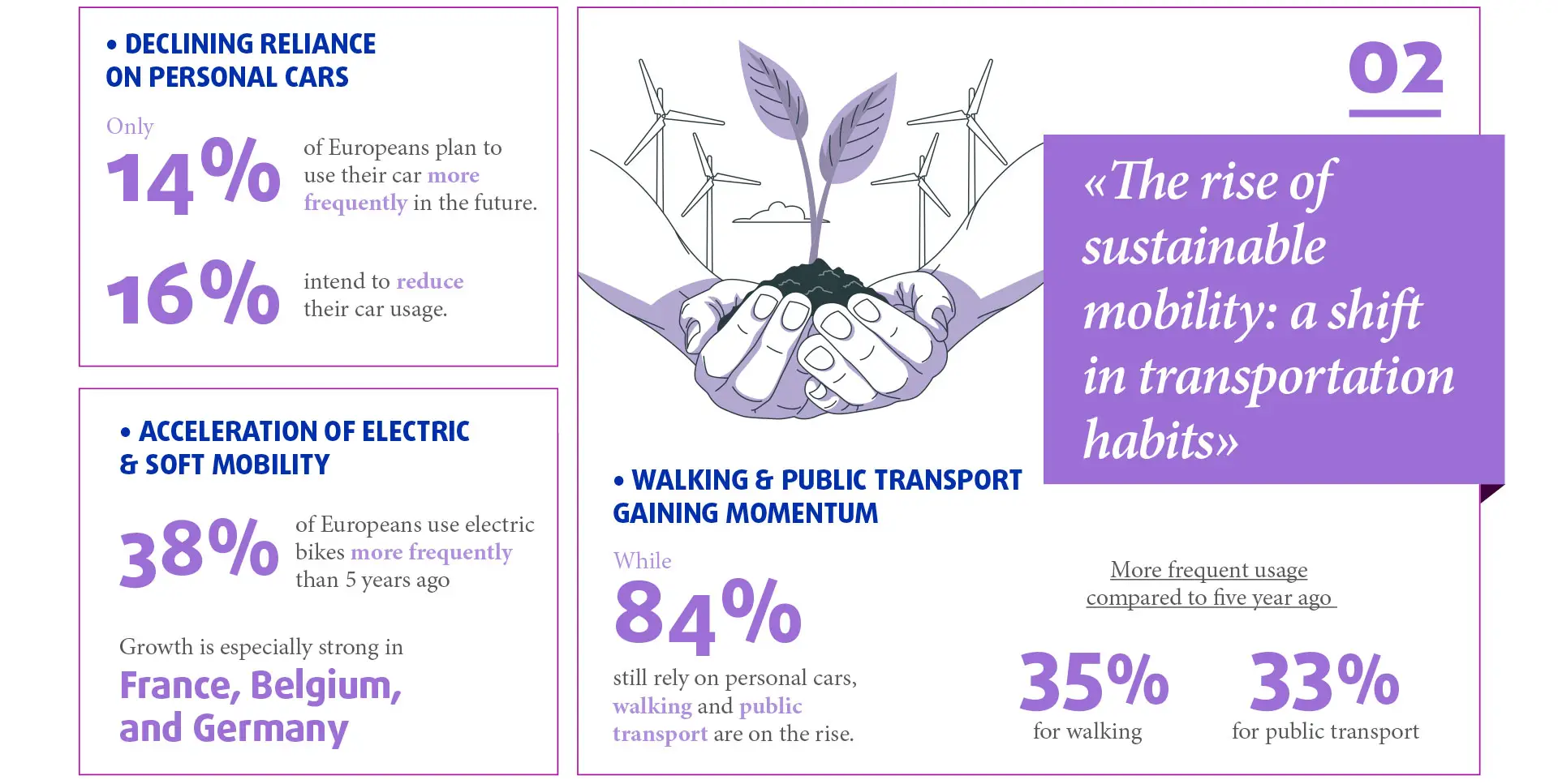 Besides EV, there is a rise in usage of soft mobility solutions (such as electric bikes, public transport or shared services) underlying a gradual transition towards more sustainable and cost-effective alternatives: 60% of Europeans say they have already changed their daily mobility habits towards greener alternatives.