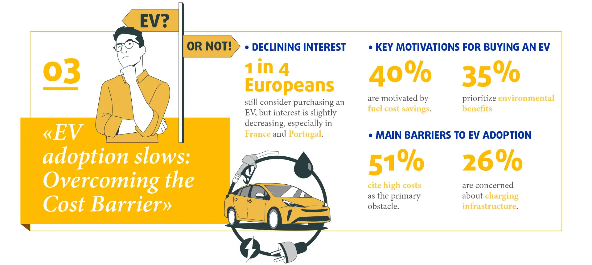 - Indeed, the primary barrier to considering an EV remains costs (51%) followed by charging points issues (26%).