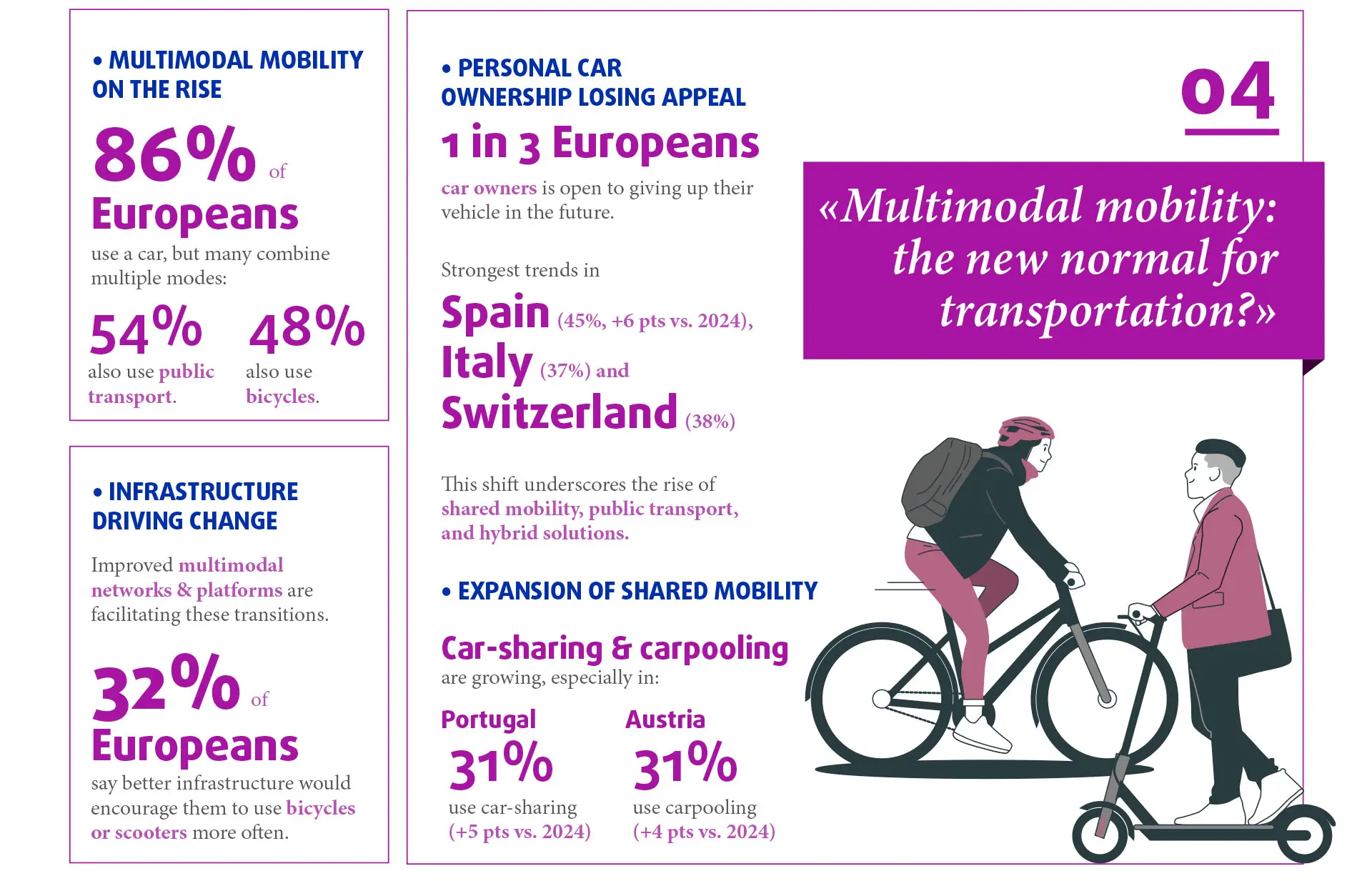 - The expansion of multimodal infrastructure and mobility platforms is making these transitions easier. Indeed, improved infrastructures are among the first motivations to support the use of personal bicycles or stand scooters (32% of the respondents say it would influence positively their usage).